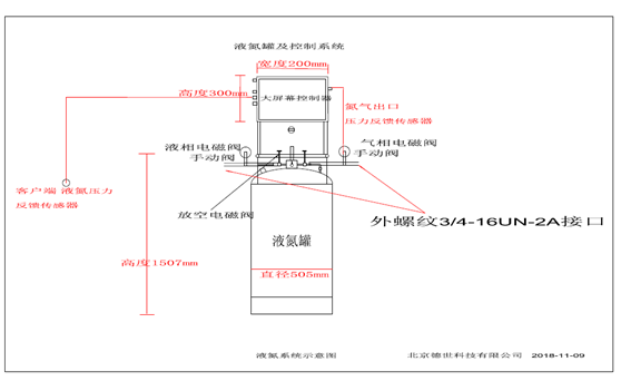液氮罐補(bǔ)液控制系統(tǒng)由液氮補(bǔ)液罐、低溫智能化控制系統(tǒng)、閥門組件控制電磁閥和真空比例閥箱、PLC編程器、智能化控制人機(jī)交互控制終端、不間斷電源、溫度及壓力傳感器監(jiān)控探頭系統(tǒng)及反饋電路系統(tǒng)組成,功能可根據(jù)客戶需求,定制相關(guān)罐體自動(dòng)增壓-出液-排氣的壓力及流量控制程序。